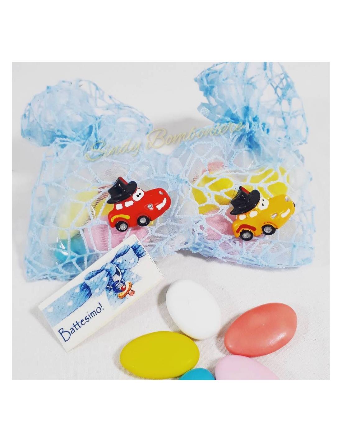 La bomboniera dinale si presenta come un sacchetto portaconfetti in rete di colore celeste, con applicato una piccola Cars di colore rosso o arancione con cappello nero.