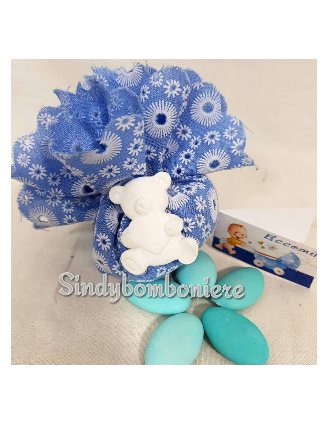 Sacchetti bomboniere per nascita, battesimo bimbo in stoffa san gallo celeste con fiorellini bianchi, gessetto profumato a forma di orsetto, 5 confetti crispo e bigliettino personalizzato. Il gessetto ha la forma di un orsetto con cuore tra le zampe.