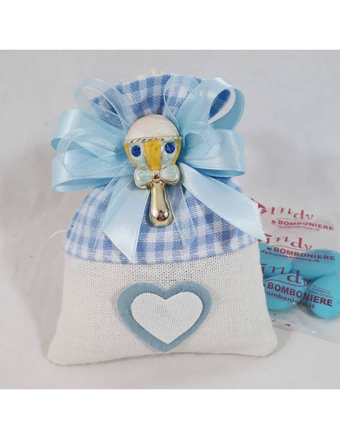 Sacchetto portaconfetti per il Battesimo del tuo bimbo in cotone di colore celeste bianco e celeste, decorato con un cuore e un fiocchetto in raso e con su di esso applicata un'applicazione magnete in resina a forma di sonaglio dorato arricchito con dei strass blu e decorazione madreperla (Dimensione: 10x8 cm circa).