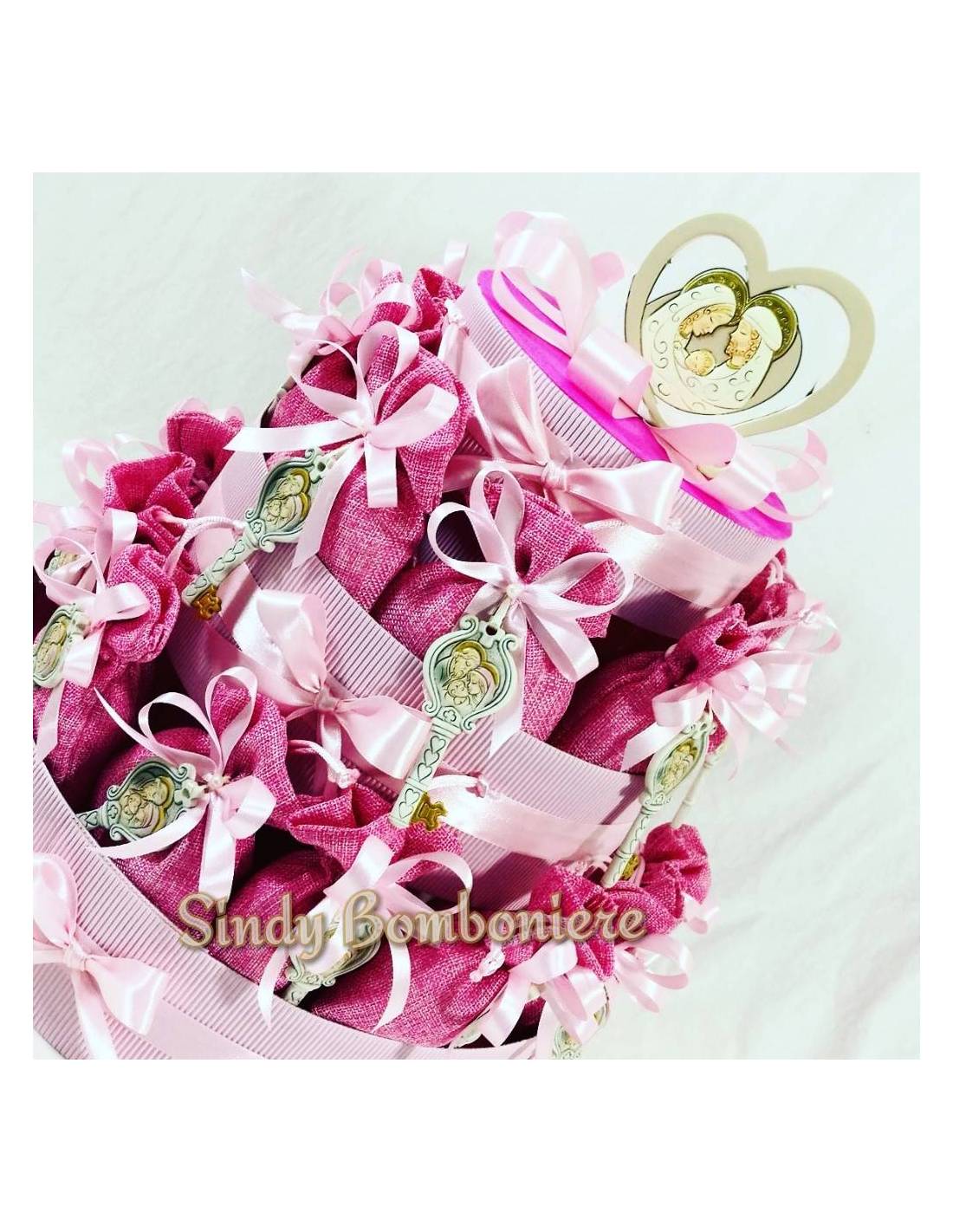 sacchetti per confetti in juta con chiave sacra famiglia per battesimo bimba