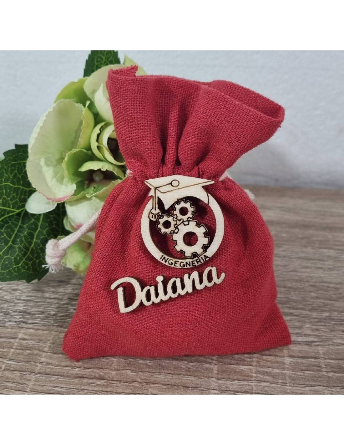 Sacchetti laurea ingegneria meccanica in stoffa rossa con applicazione in legno e il nome del laureando/a.