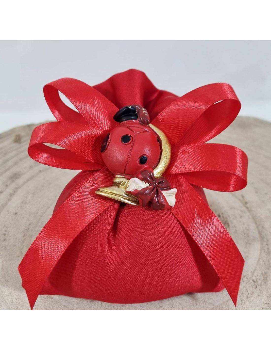 Bomboniere Laurea eleganti sacchetti portaconfetti tessuto nero con decoro tocco e tesi con nappina rossa.