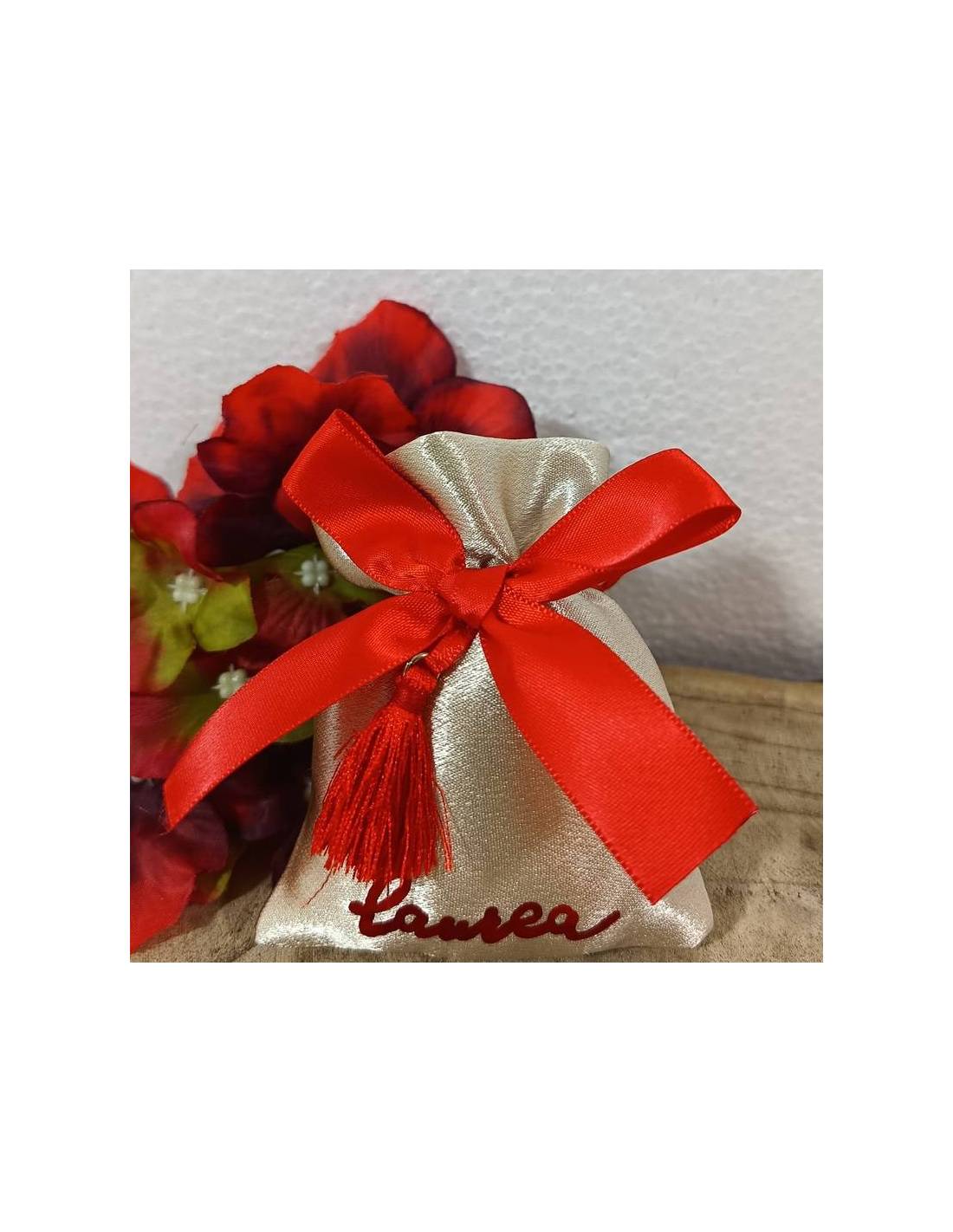 Sacchettini portaconfetti in stoffa rossa con decoro fiocco rosso e appendino a pois con ciondolo quadrifoglio portafortuna.