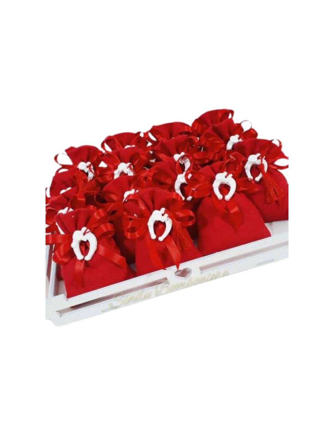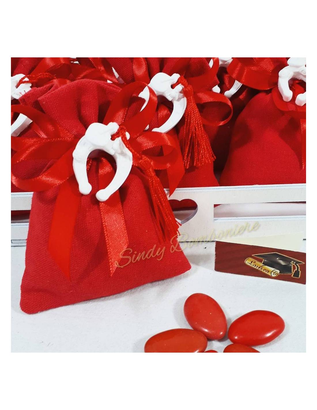 Bomboniera per evento di laurea, sacchetti in cotone completamente rossi arricchiti con un fiocco in raso, sempre di colore rosso, e con su applicato un gessetto profumato a forma di staffa di cavallo con nappina rossa. I sacchetti contengono sia confetti che bigliettini personalizzati e sono confezionati all'interno di una cesta in legno bianco.