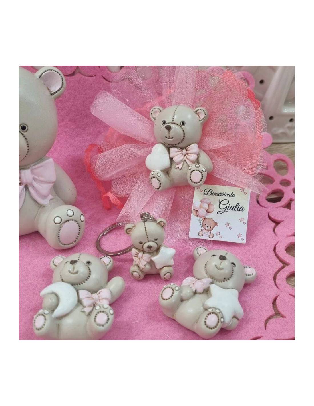 Dimensioni bomboniere nascita orsetto magnete in resina 5 cm circa e portachiavi completo 8 cm circa
