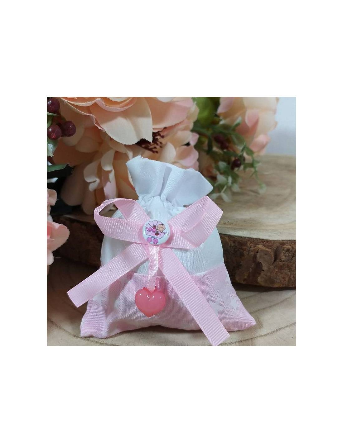 Ti presentiamo questi sacchetti nascita bimba realizzati in ottimo cotone nei colori bianco e rosa, dalla dimensione di 11 cm circa.