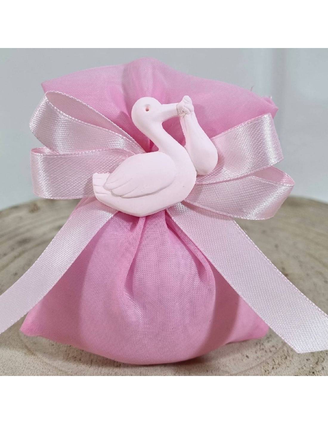 Al centro dei sacchetti bomboniere nascita bimba c'è un fiocco in raso rosa con il gessetto a forma di cicogna rosa che trasporta il fagottino.