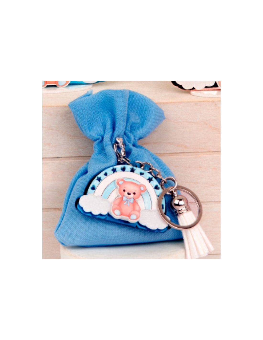 Sacchetti per confetti bimbo in stoffa celeste con portachiavi che rappresenta un arcobaleno in legno con orso su base di plexiglas blu a portachiavi.
