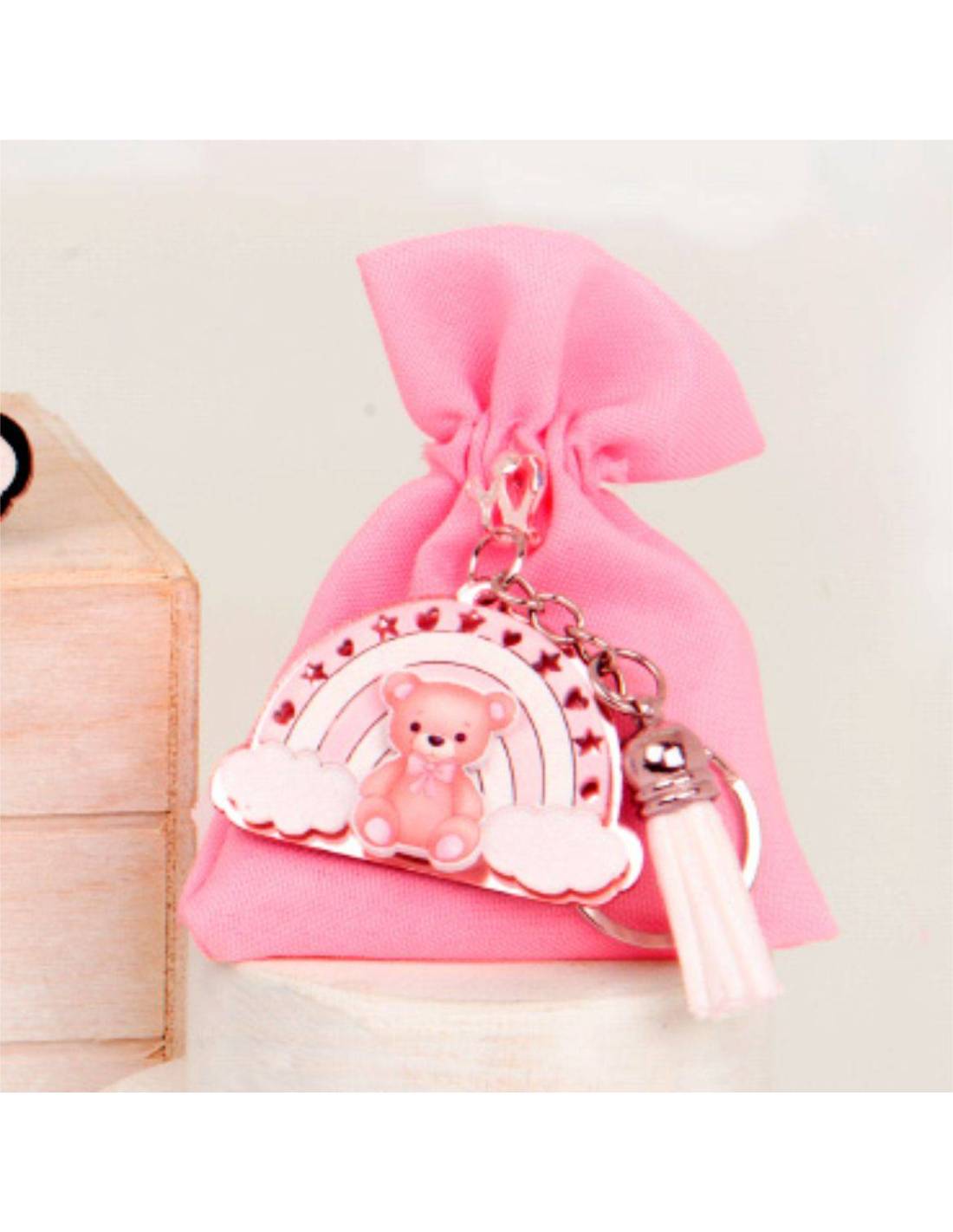 Sacchetti per confetti bimba in stoffa rosa con portachiavi che rappresenta un arcobaleno in legno con orso su base di plexiglas rosa a portachiavi.