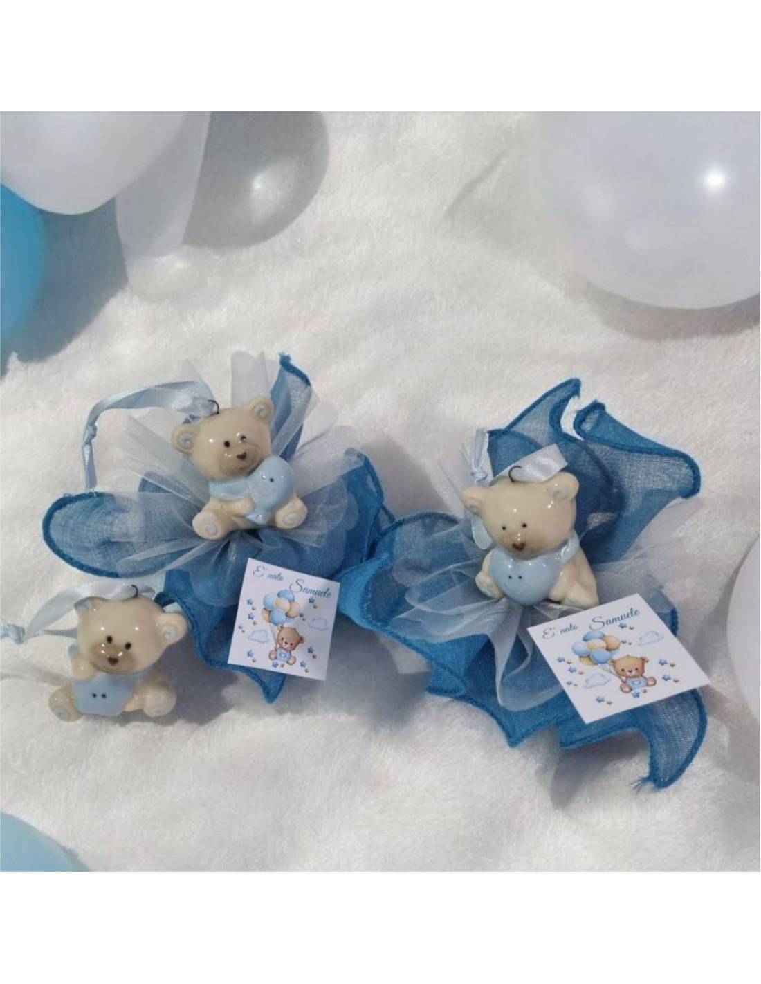 al centro un fiocco in raso con il cuore in gesso profumato con la scritta " E' nata".
