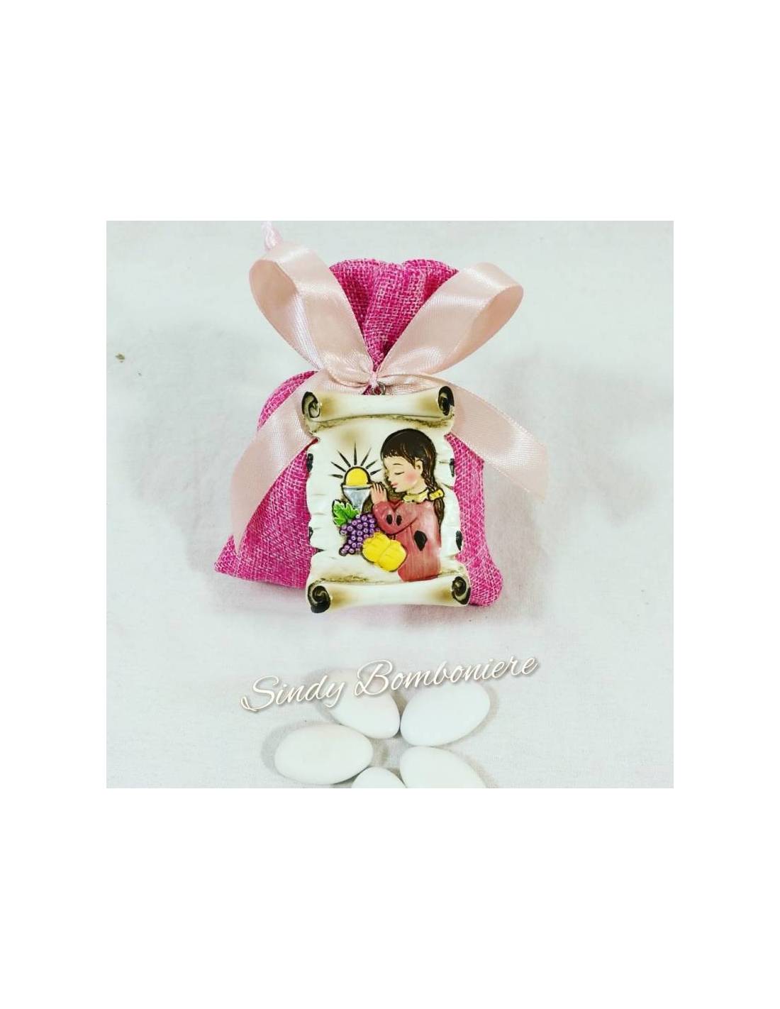 Idea bomboniere Comunione bimba sacchetto juta pendente pergamena arrotolata calice Sacramento