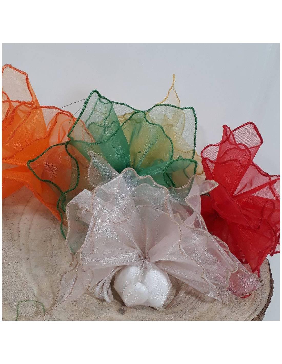 Sacchetti per confetti ideali per qualsiasi evento in 5 colori, rosso, arancione, tortora, verde, giallo.