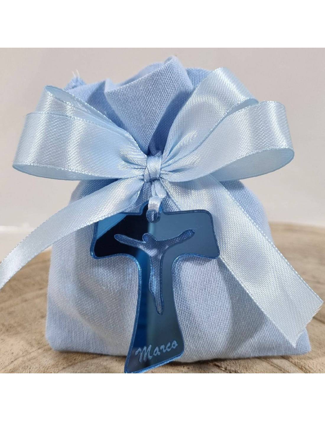 Tau in plex azzurro specchiato che decorano i sacchetti confetti Comunione già confezionati e pronti da regalare.