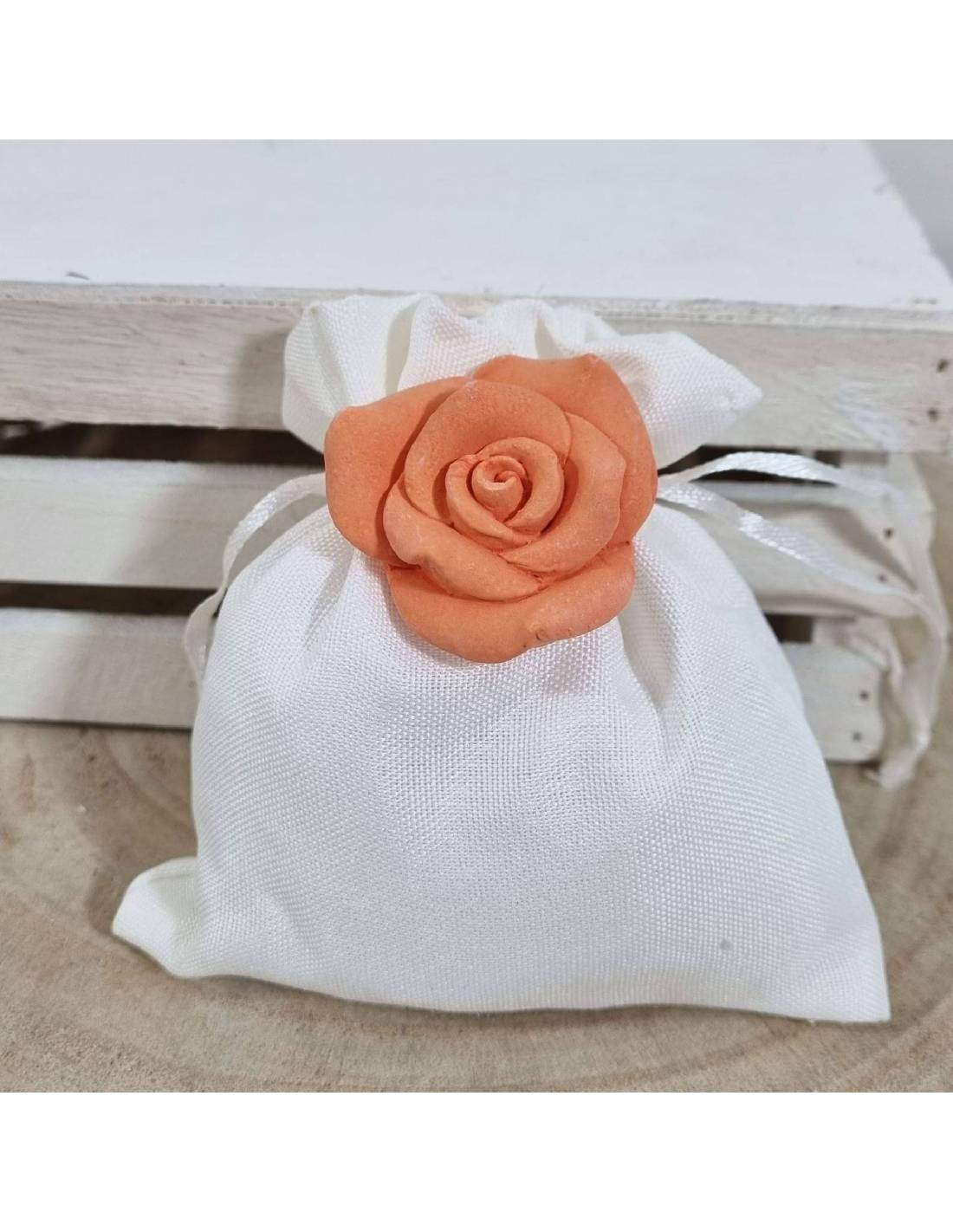 Sacchetti confetti Comunione in cotone morbido effetto juta con al centro un gessetto a forma di rosa color arancione.