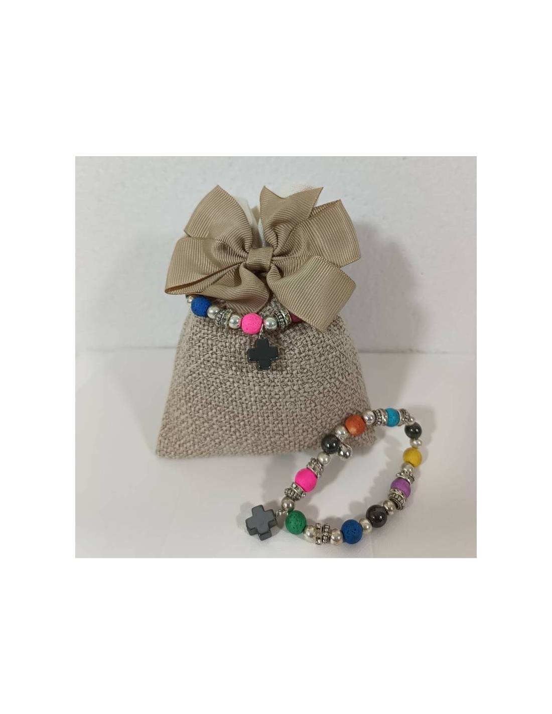Sacchetti bomboniere comunione online prezzi bassi! Sacchetto bomboniera comunione in cotone con fiocco, bracciale rosario con pietre dai colori unisex e crocetta in pietra. Dimensioni sacchetto 10cm