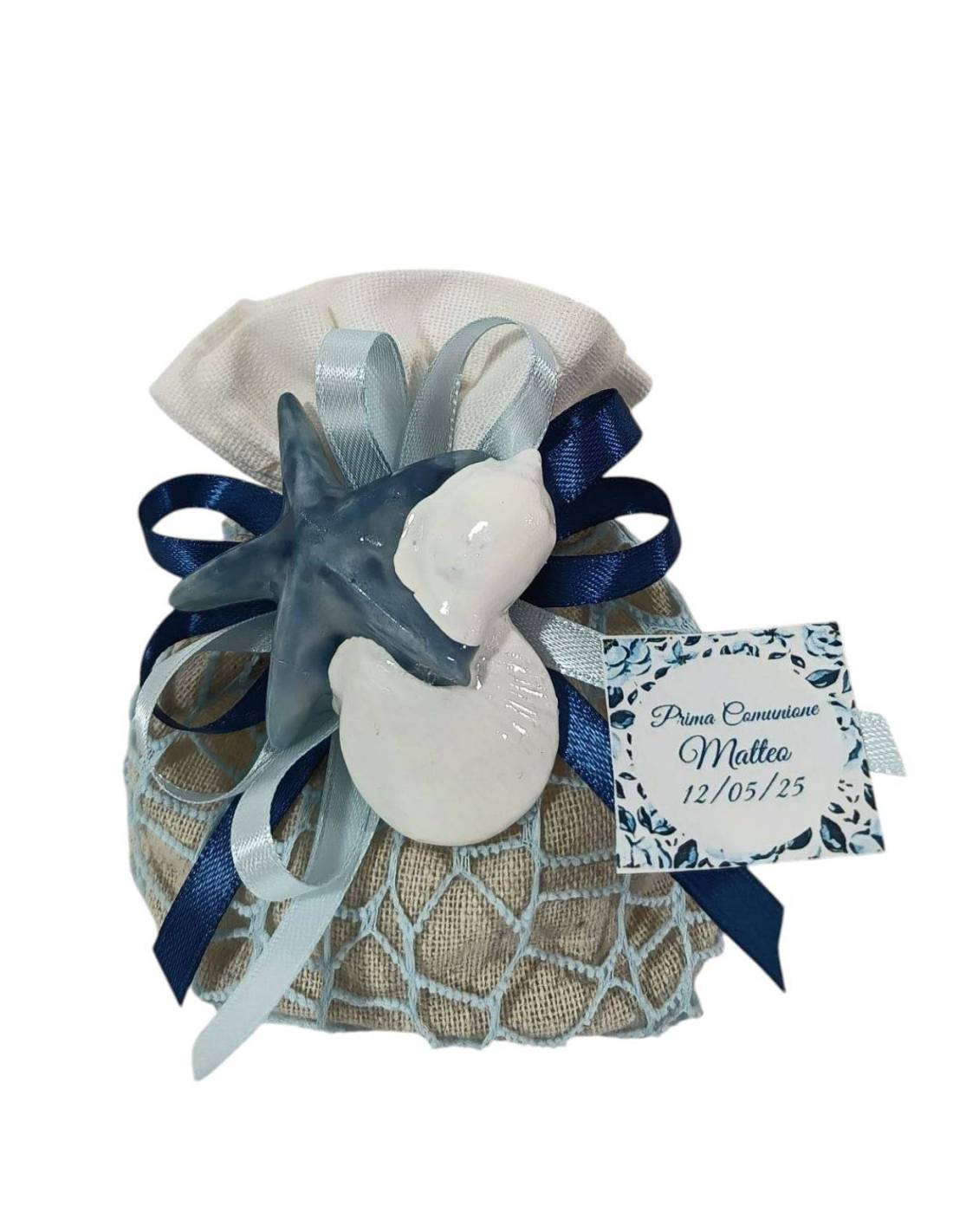 Originali sacchetti portaconfetti decorati in stile mare con nastri e magnete in ceramica.