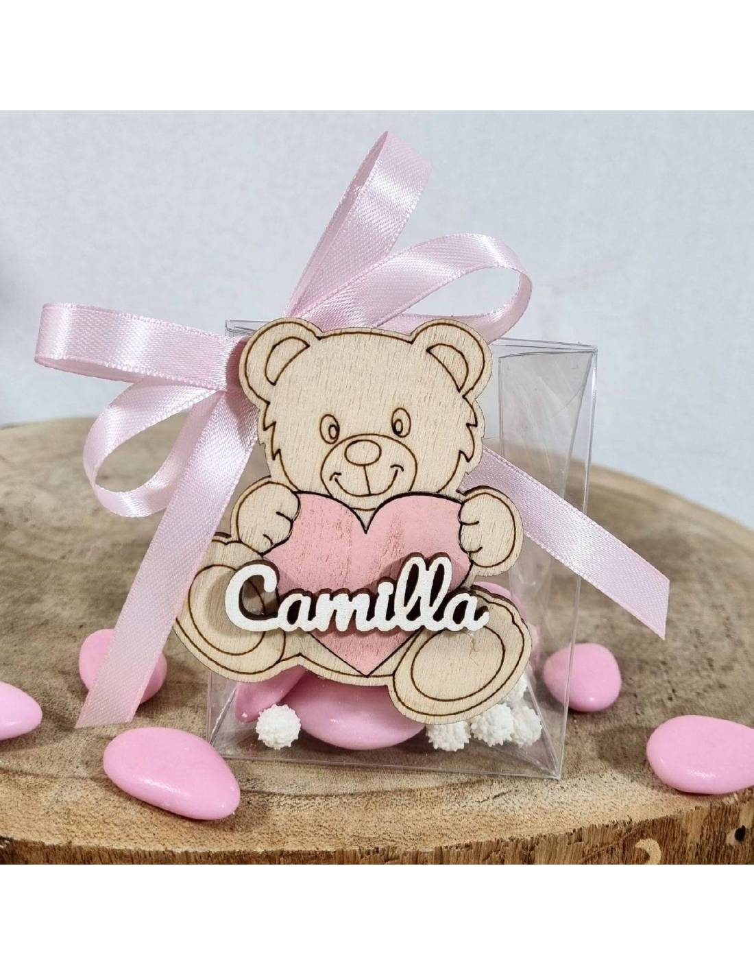 BELLISSIMO PORTA CONFETTI TEDDY BEAR ROSA con il nome della tua bimba