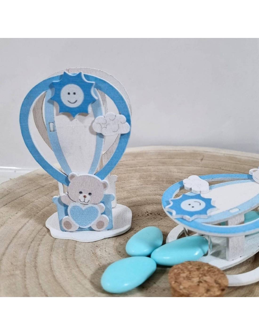Portaconfetti nascita maschio mongolfiera in legno celeste e bianca con sole e nuvoletta e alla base l'orsacchiotto cuore.