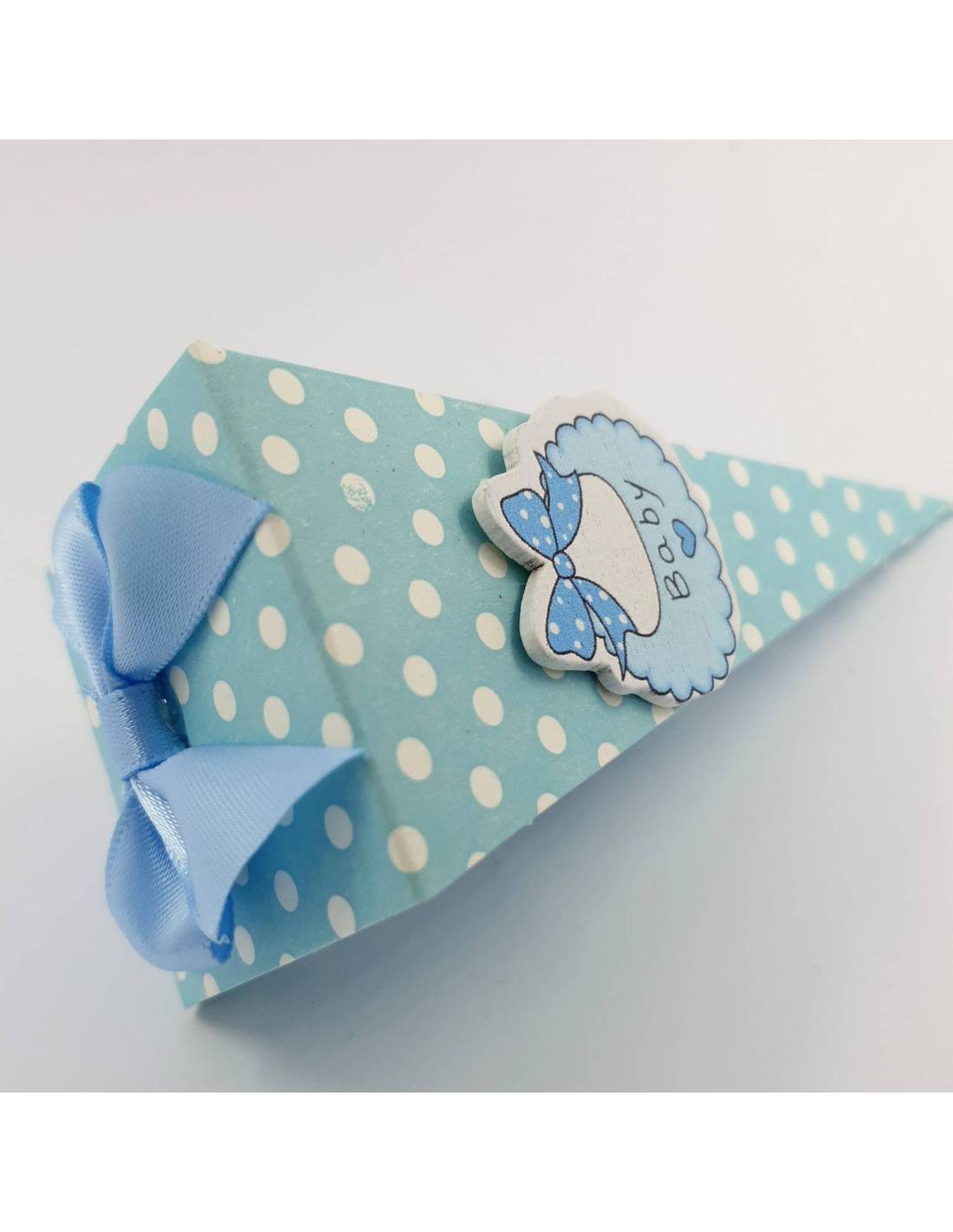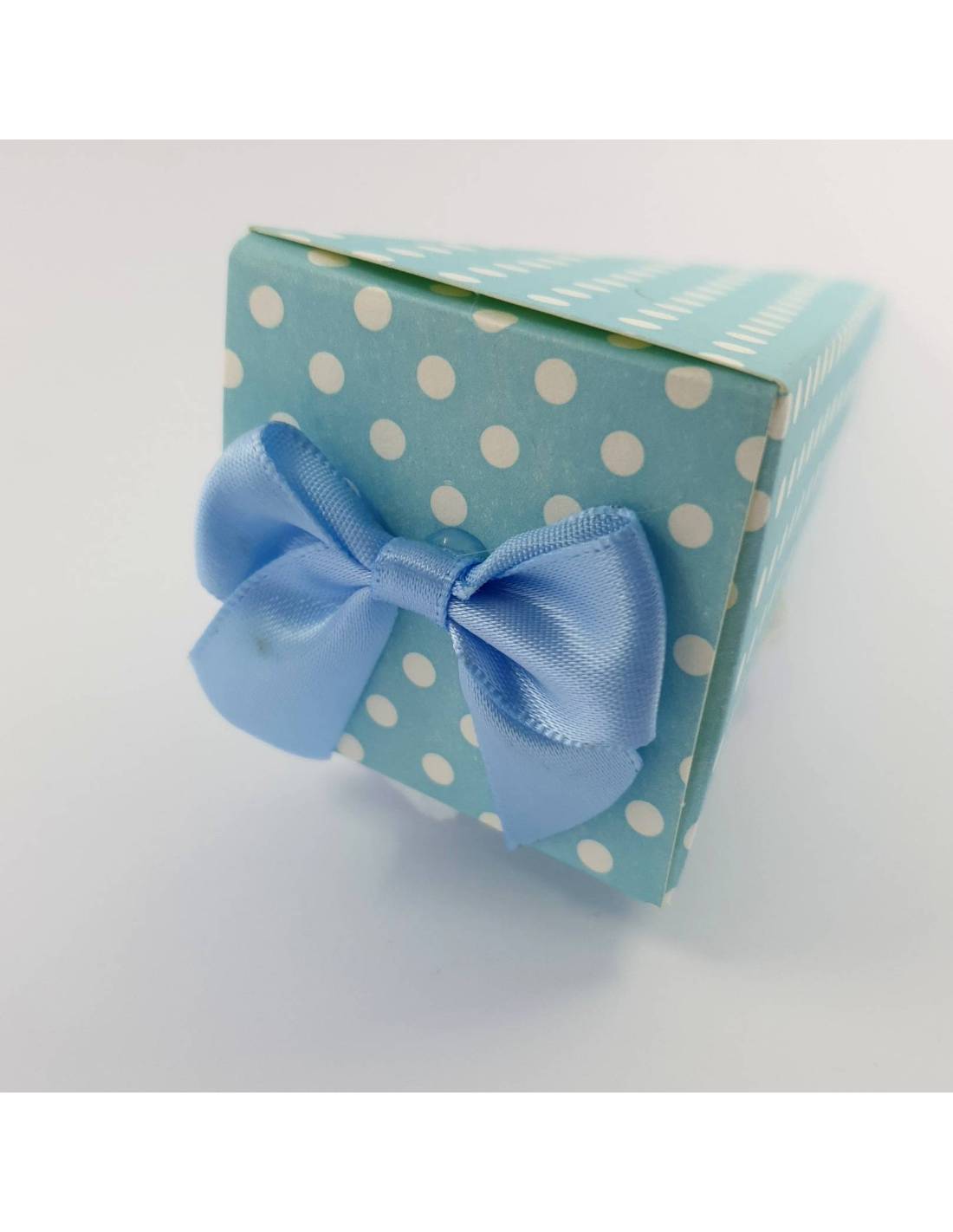 Scatolina a forma di coni di color azzurro cielo con pallini bianchi per portaconfetti bambino.