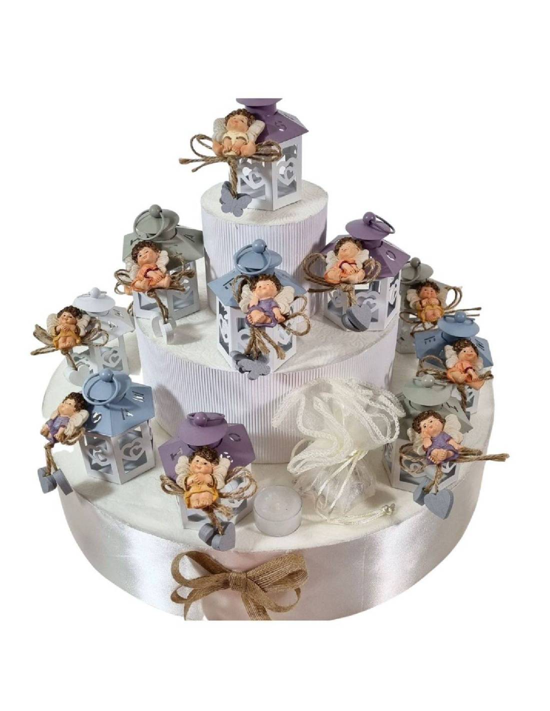 Bomboniere Comunione lanterna a torta completa di fiocco angelo, sacchetto, confetti, candela e bigliettino.