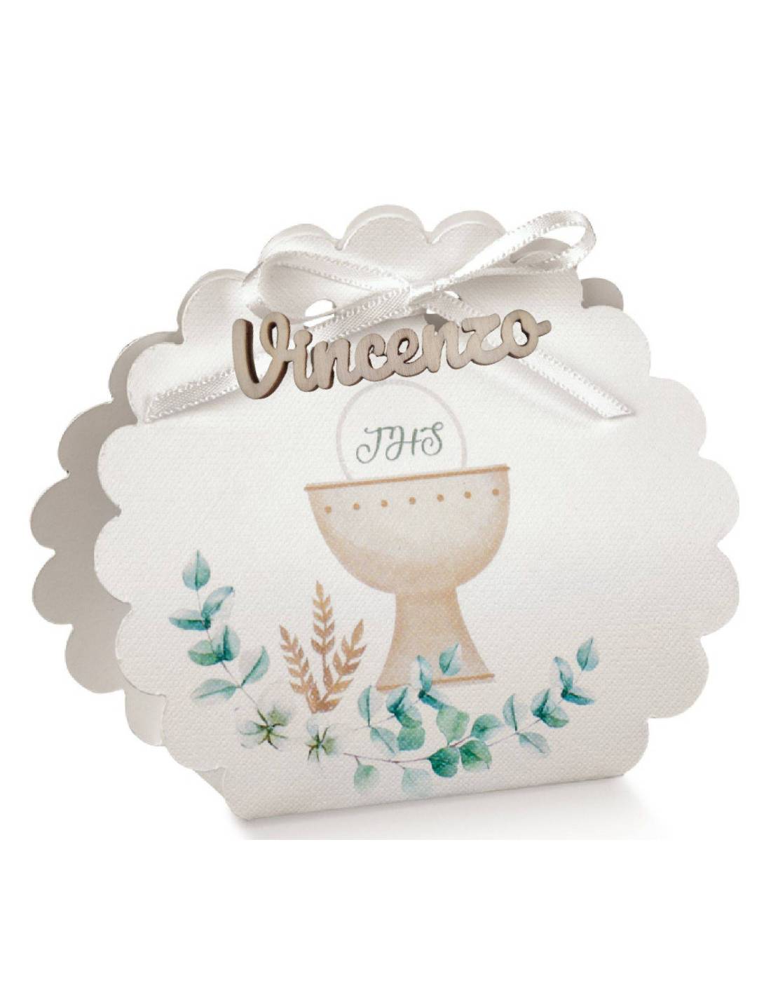 Torta bomboniera albero della vita in legno con immagine comunione al centro.