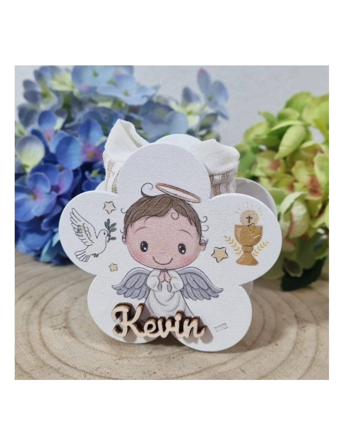 Portaconfetti bomboniera Comunione semplice ma che richiama il senso religioso e personalizzabile con nome in legno.
