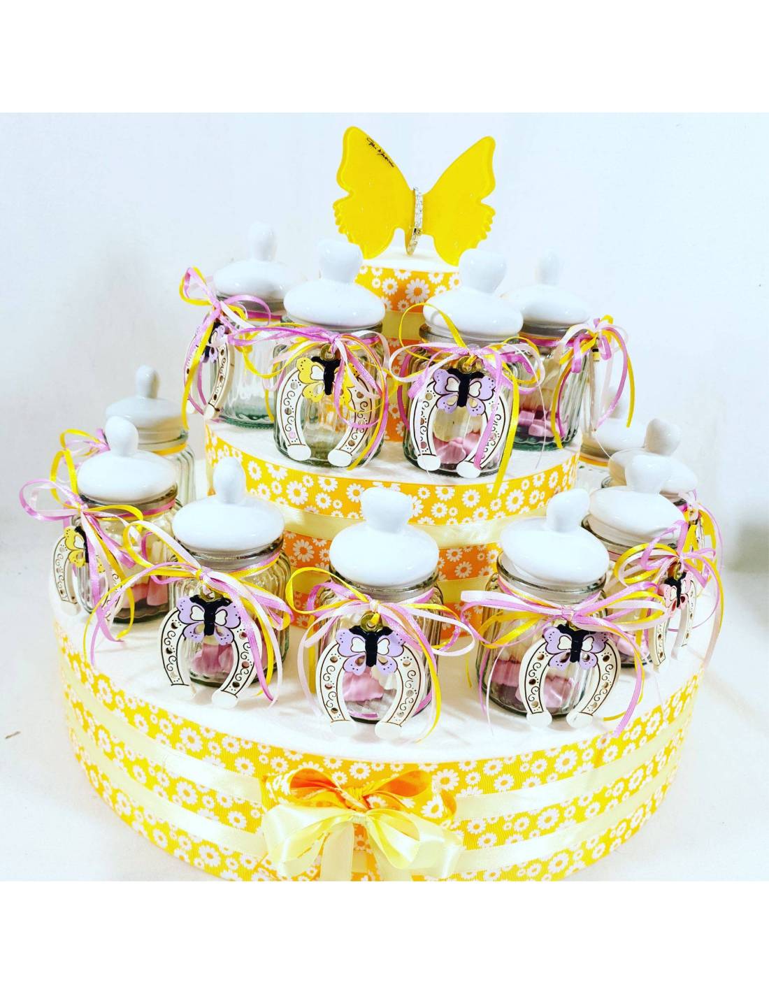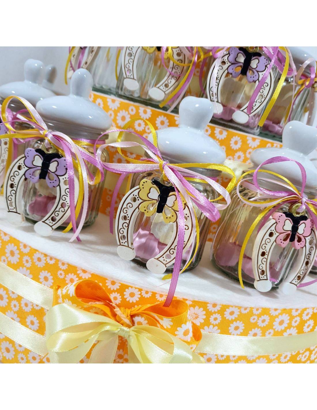 Vasetto con tappo in ceramica a forma di cuore con intorno nastri in raso e staffa di cavallo con farfallina, all'interno dei vasetti portaconfetti ci sono i marshmallow e i confetti al cioccolato. Il centrale a farfalla gialla è una bomboniera Gai Mattiolo che è compresa acquistando la struttura completa.