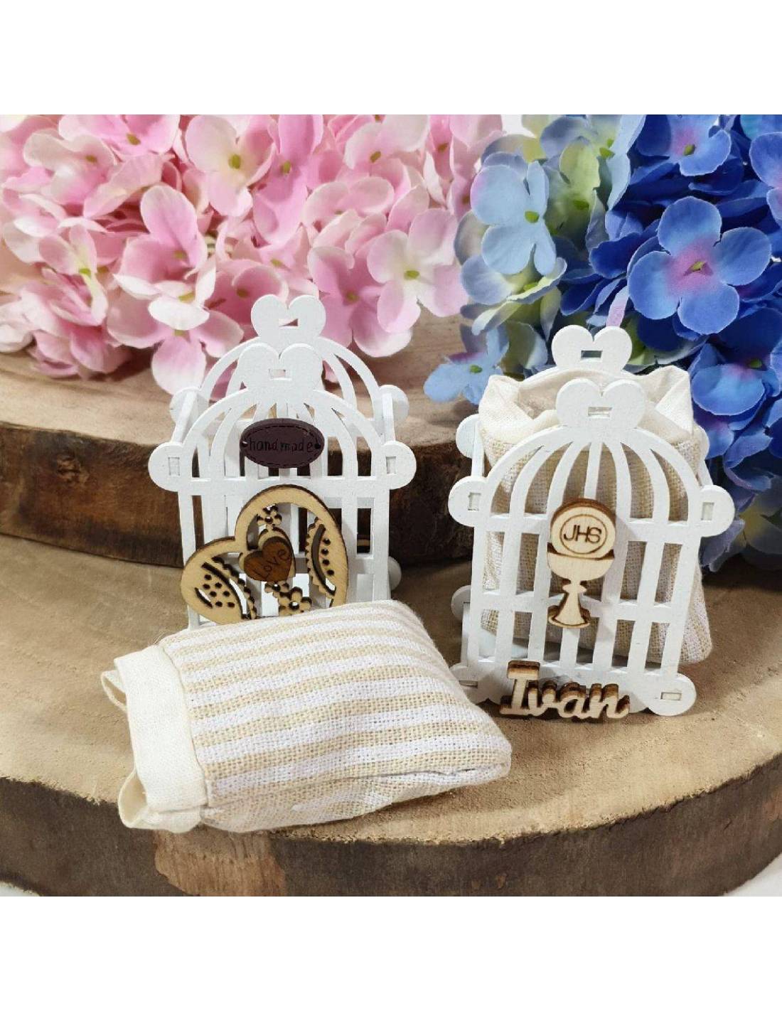 Scatolina porta confetti comunione gabbia in legno cuore calice e nome