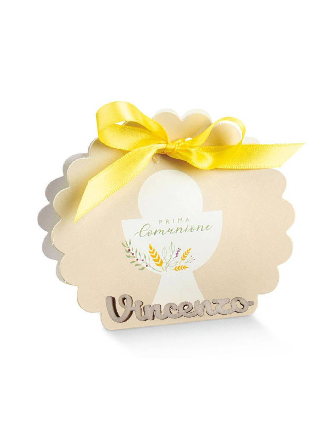 Queste scatole portaconfetti Comunione sono di colore beige con la stampa di un calice con al centro la scritta "Pima Comunione".
