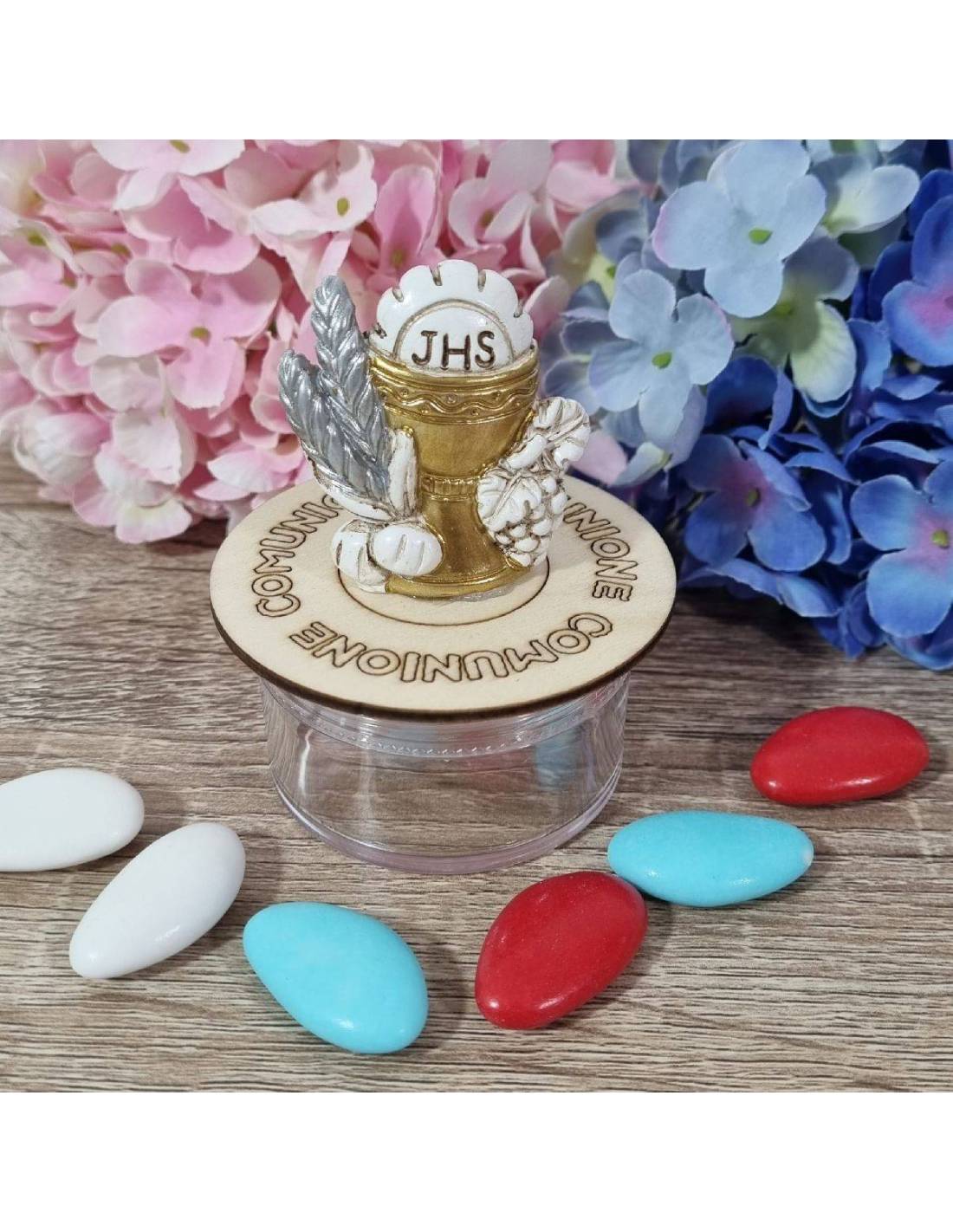 Portaconfetti Comunione in plexiglass con tappo avvitatore che ha il decoro in legno con l'incisione del Sacramento.