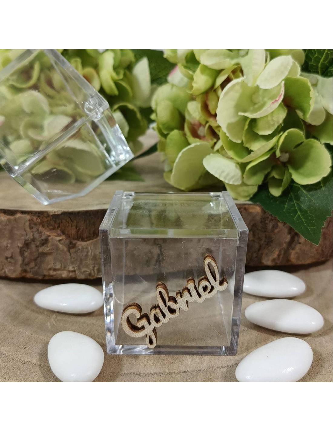 Scatoline Comunione in plexiglas cubo trasparente da personalizzare con nome in legno e angolo smussato.