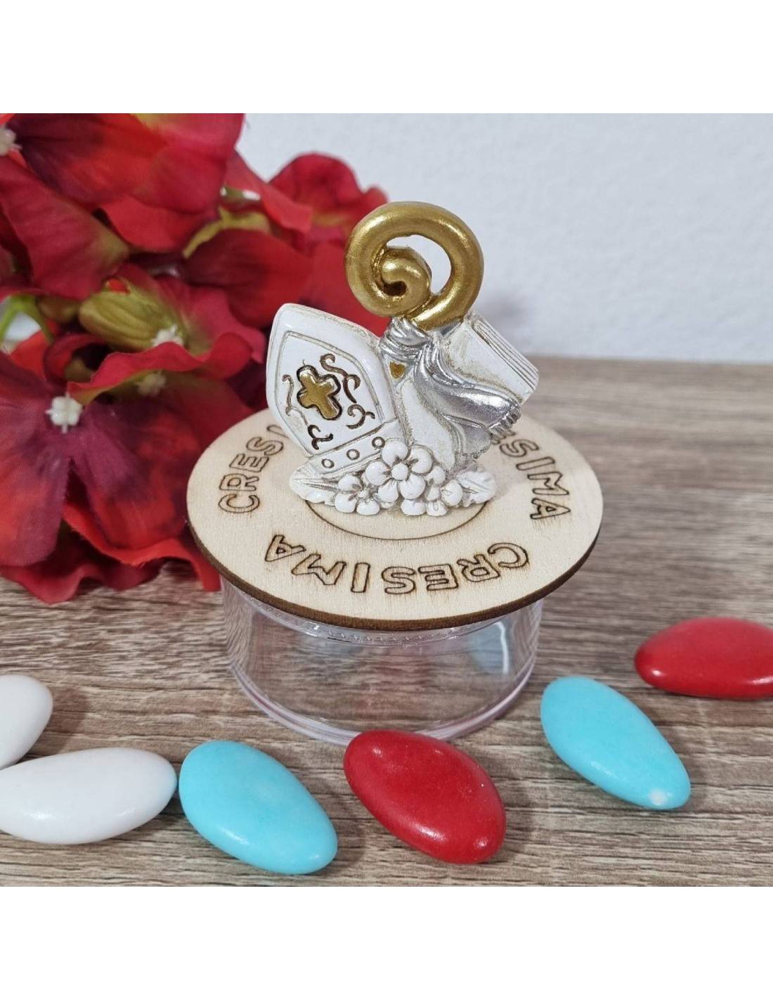Sul tappo delle scatoline portaconfetti Cresima fai da te l'icona sacra che rappresenta il cappello del vescovo cioè la mitria e il bastone i resina.