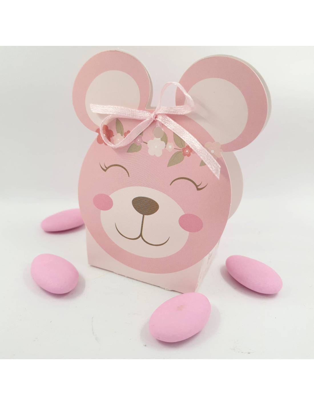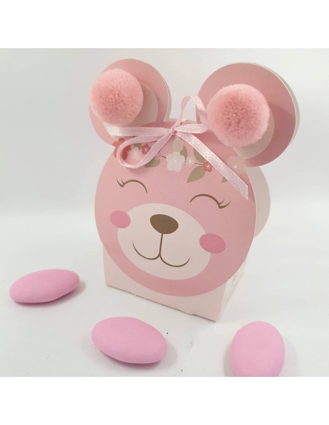 Scatola con sagoma della testa di orso con musetto dolcissimo da poter scegliere con pompon rosa o senza per realizzare delle scatoline portaconfetti bimba economiche ma di effetto.