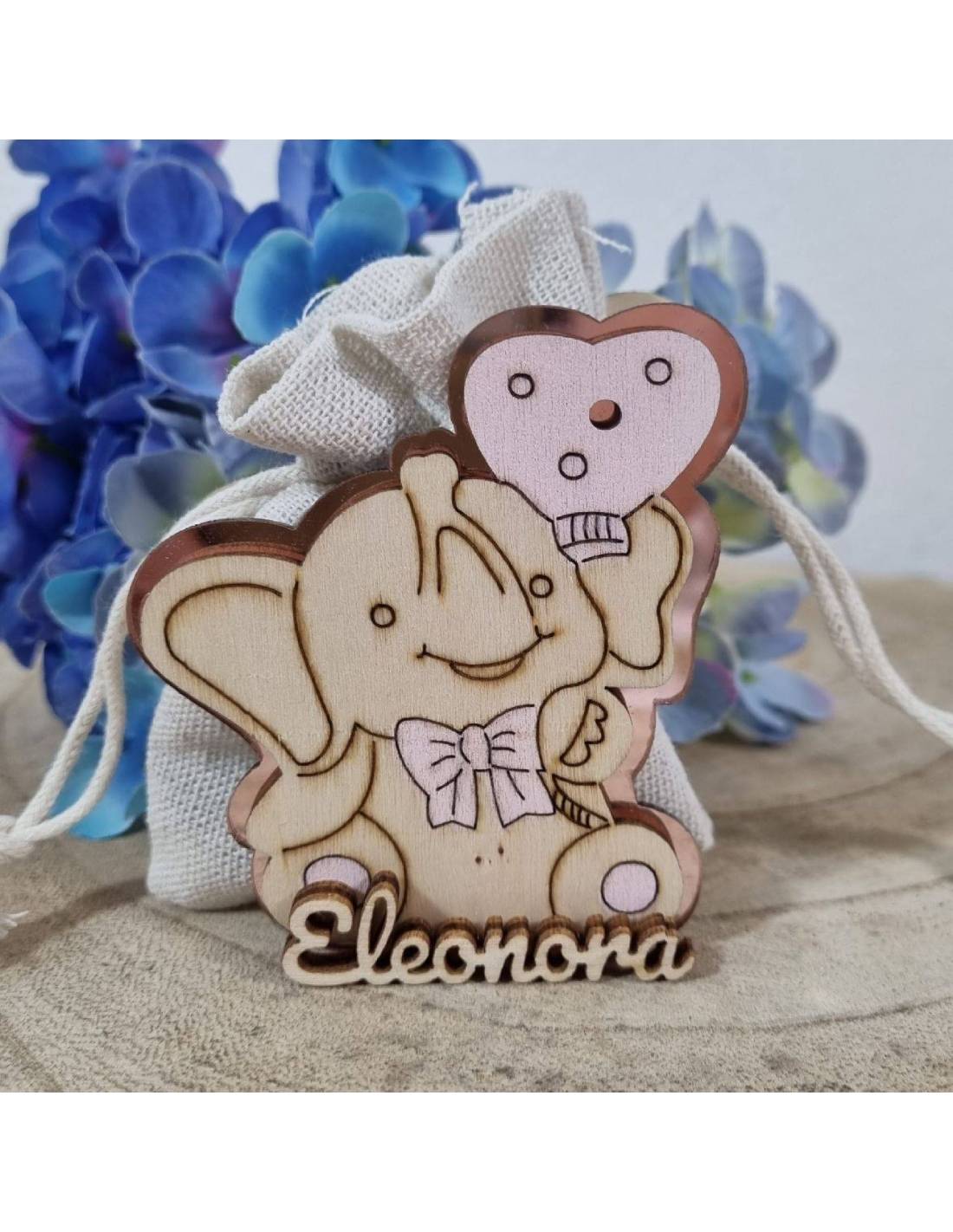 Scatolina a forma di Dumbo con palloncini in legno e plexiglass rosa, economici porta confetti per Battesimo bimba.