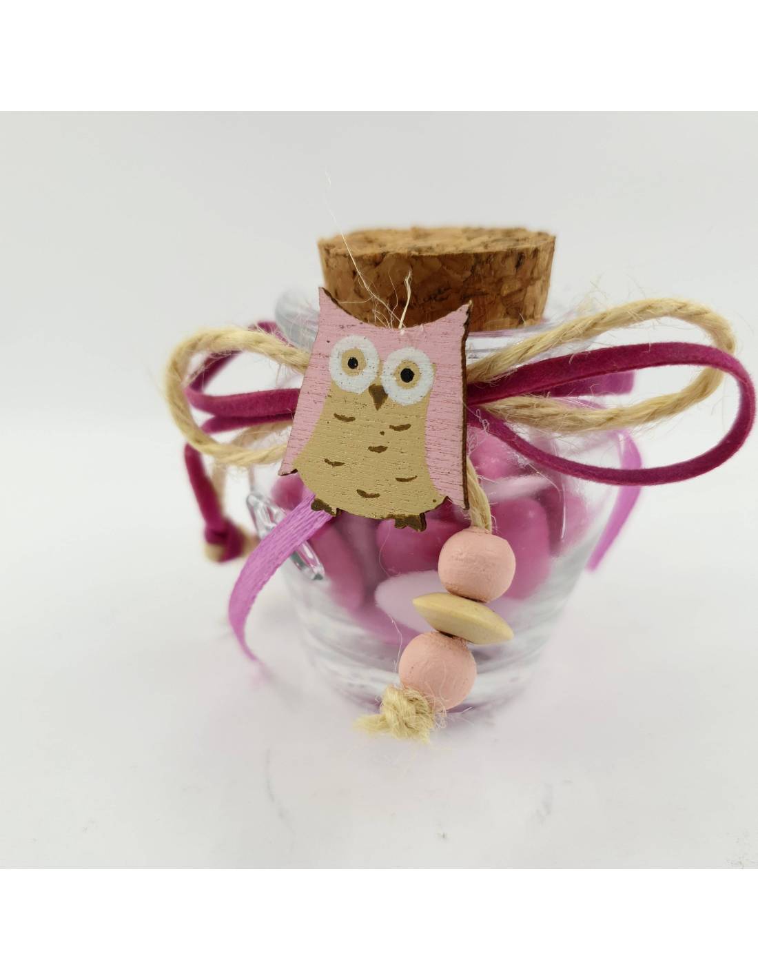 Vasetto in vetro portaconfetti Battesimo bimba con simpatico gufetto rosa