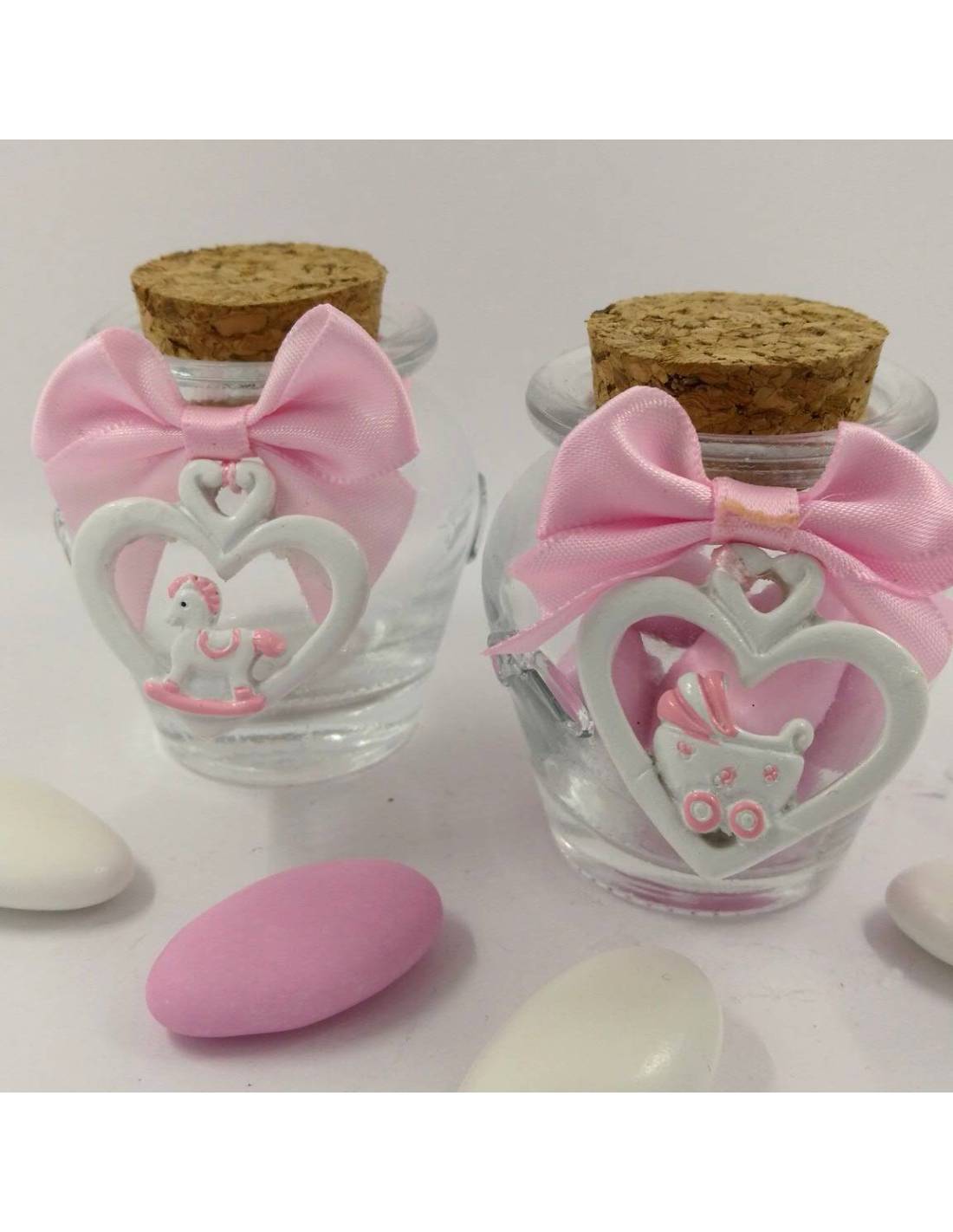 Il barattolino in vetro portaconfetti bambina Battesimo ha il ciondolo a forma di cuore bianco in 2 varianti assortite con culla e con cavalluccio e un fiocco rosa.