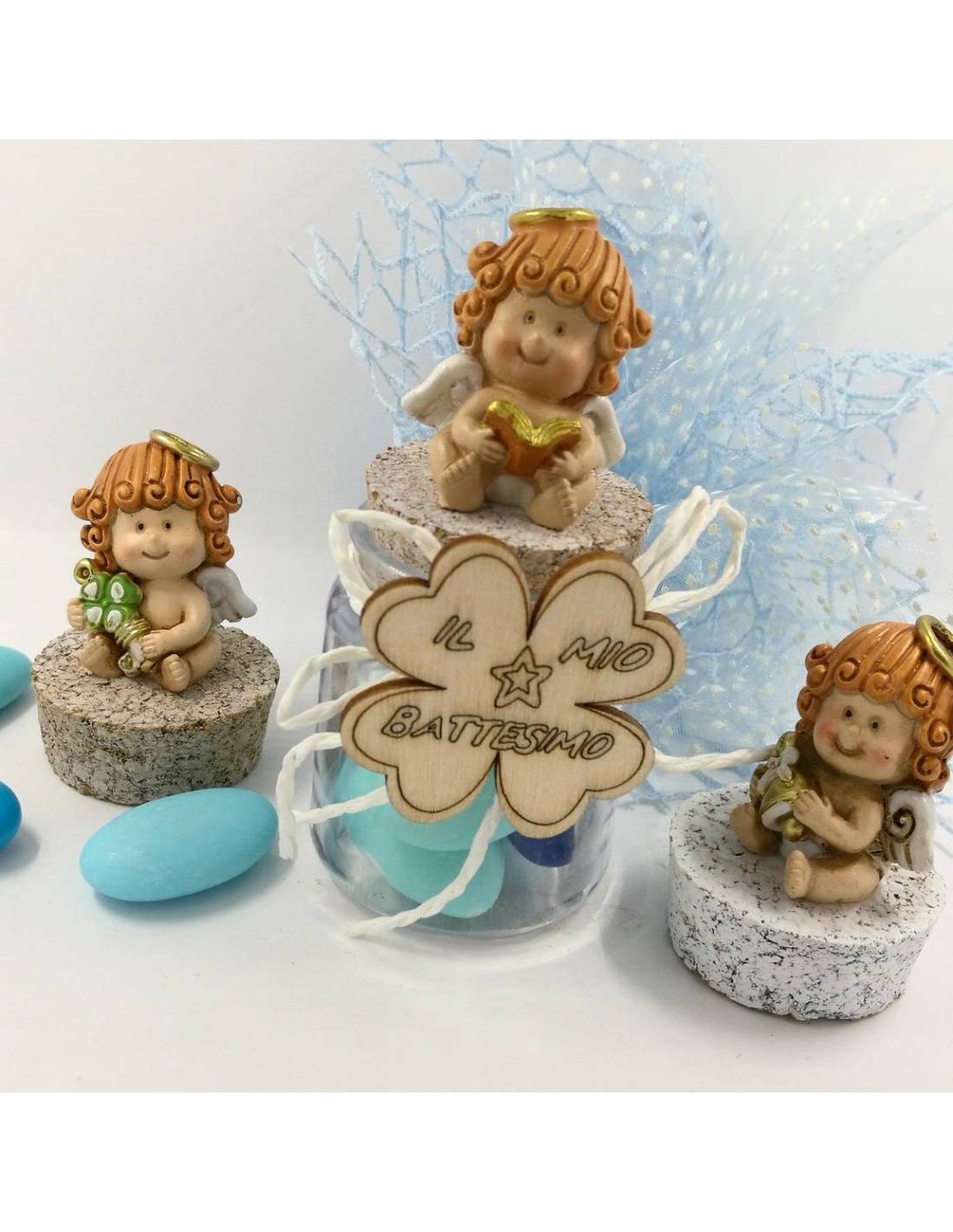 Torta bomboniera Battesimo vasetti portaconfetti con animaletti composta da vasetti in vetro ad anfora decorati con nastrino blu (se acquistato confezionato altrimenti nastro a parte) + tappo di sughero sul quale si poggia un animaletto assortito tra: cagnolino, panda, orsetto,...