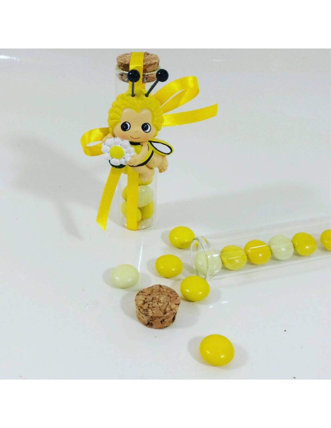 Originali portaconfetti Prima Comunione ape Maia a calamita confezione su provetta in vetro con deliziosi confetti a forma di lenticchie.