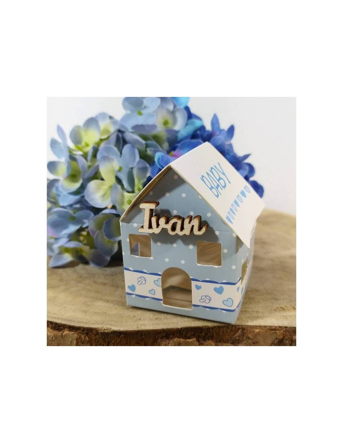 E' una scatolina bomboniera a forma di casetta stampa baby e cuoricini dentro cui puoi inserire confetti e bigliettini.