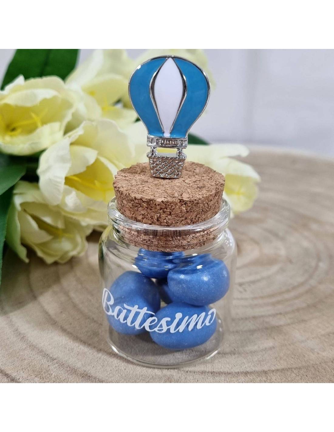 Bomboniere Battesimo con vasetti di vetro bimbo e tappo in sughero con spillone in metallo a forma di mongolfiera bianca e celeste