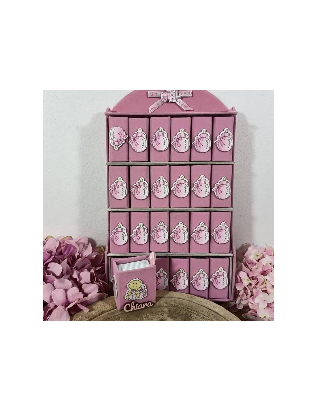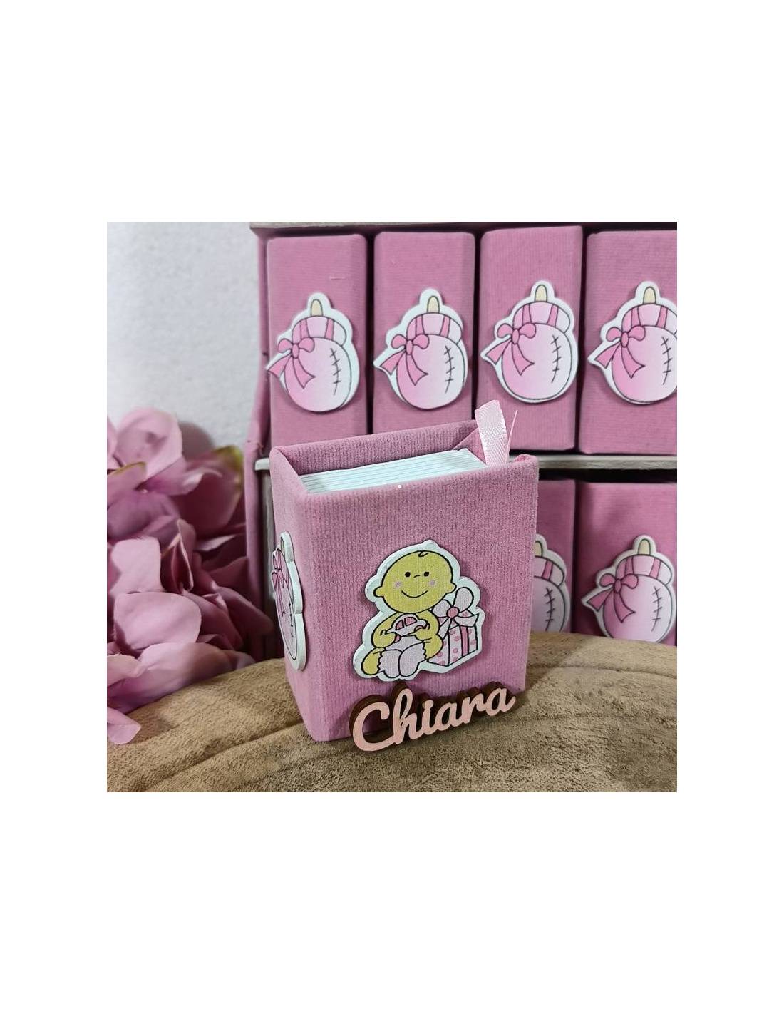 Scatoline portaconfetti che rappresentano libro rosa con bebè, biberon e nome personalizzato in legno colore abbinato.