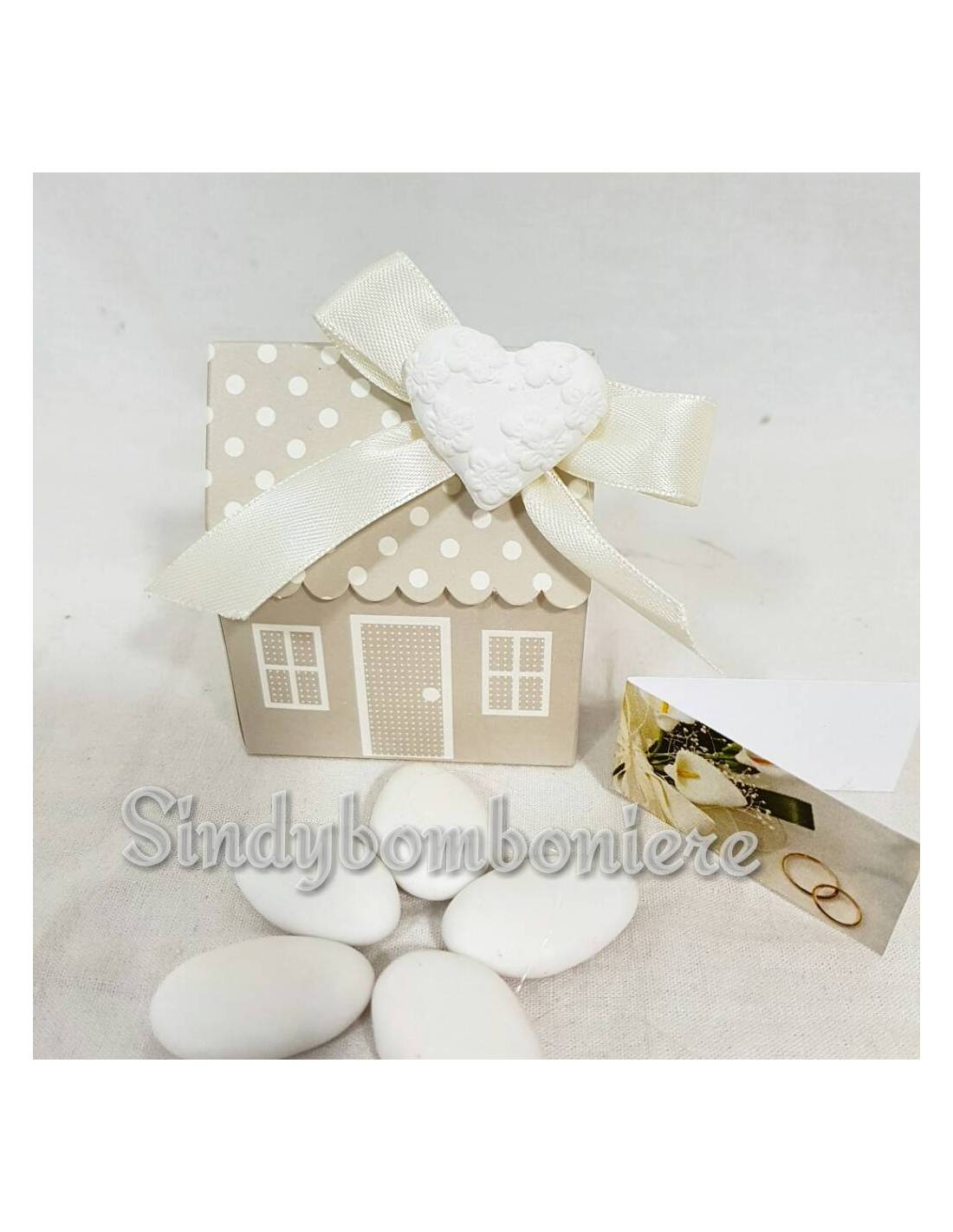 Scatolina a forma di casetta in cartoncino color tortota con la stampa di porta e finestre, ed il tetto con i pois bianchi. Sopra c'è in fiocco di rosa con il cuore in gessetto con i fiori in rilievo, ed in ogni scatolina bomboniera ci sono 5 confetti Crispo e bigliettino personalizzato.