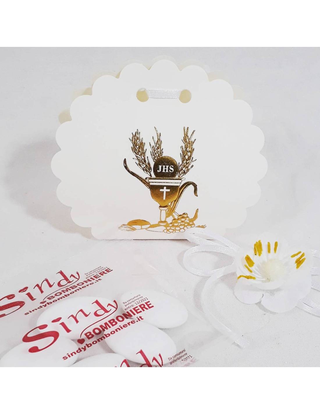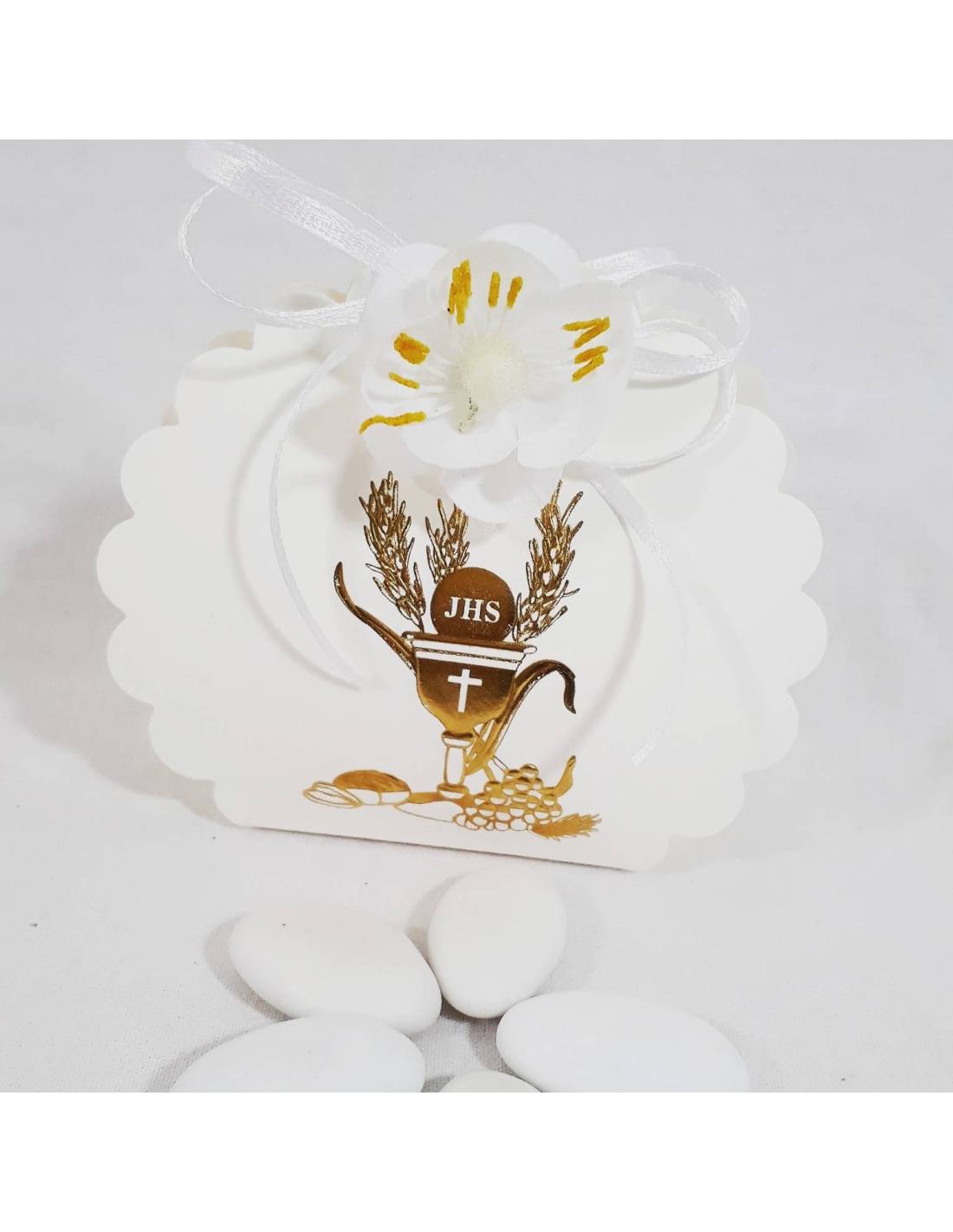 Scatolina portaconfetti comunione bomboniere online economiche! Scatoline per confetti bomboniere prima comunione prezzi bassi confezionati con nastrino in raso con fiore centrale,5 confetti crispo, bigliettino personalizzato. La scatolina ha il bordo smerlettato e la stampa oro in rilievo che raffigura il calice con l'ostia, il vangelo, le spighe di grano: simboli della prima comunione. Dimensioni 10x9h cm circa.