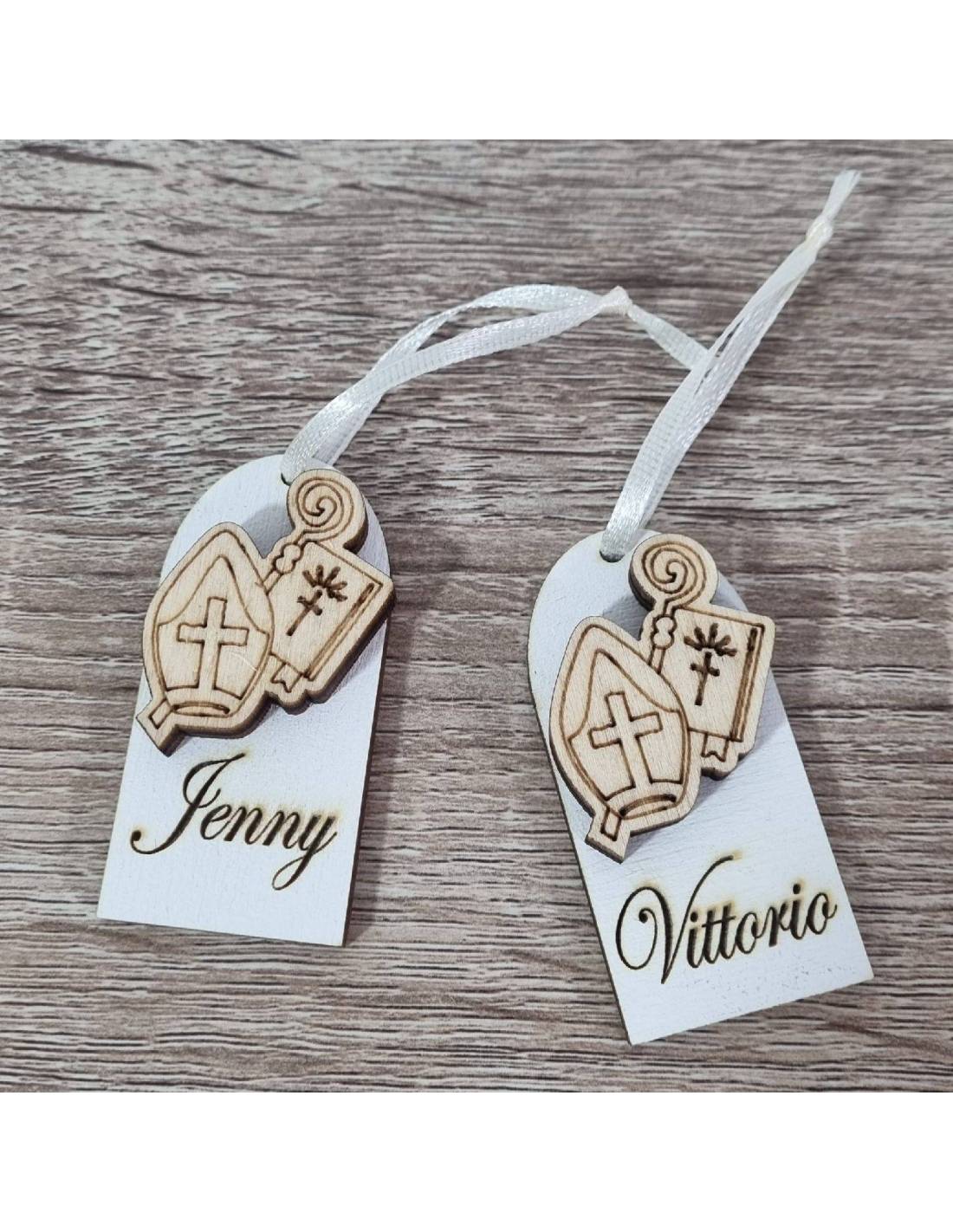 Segnaposto per Cresima fai da te tag in legno con il simbolo della mitria e i nomi incisi degli invitati (puoi sceglierli anche con nomi uguali).