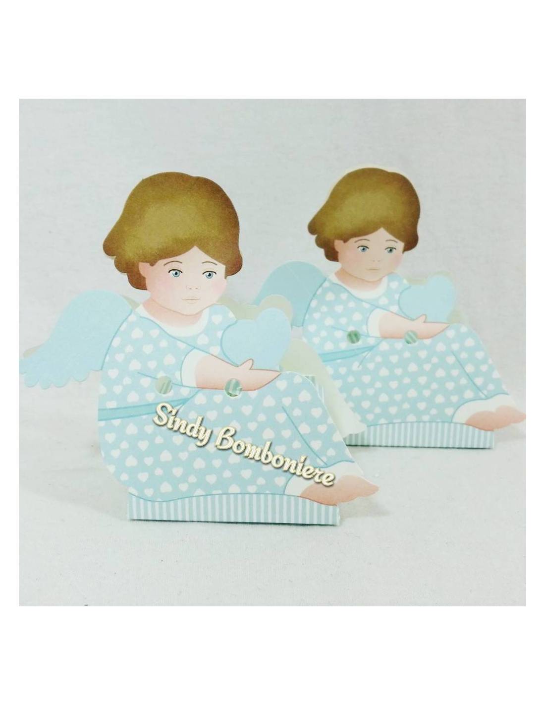 bellissimo segnaposto raffigurante un bimbo seduto con vestitino azzurro a pois banchi e in mano un cuoricino azzurro (Dimensione: 6 x 4 x 10 cm circa)