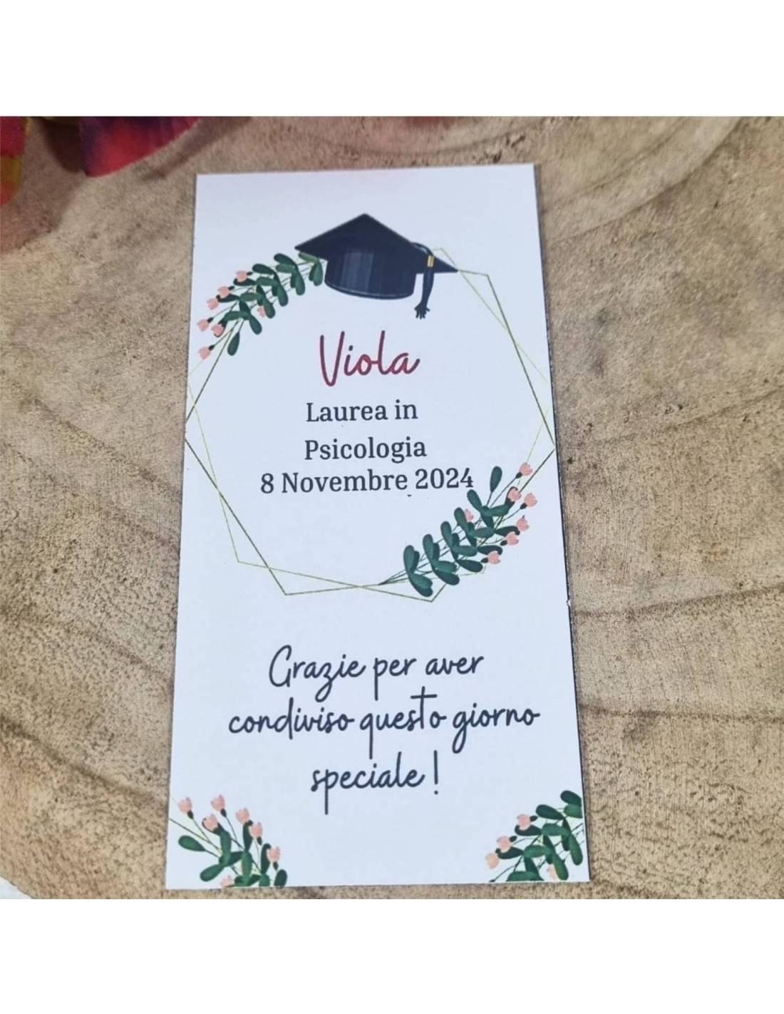 Segnaposto laurea con cartoncino con la stampa personalizzata e la frase da poter cambiare con tocco e cornice esagonale che ha il decoro con bacche rosa.