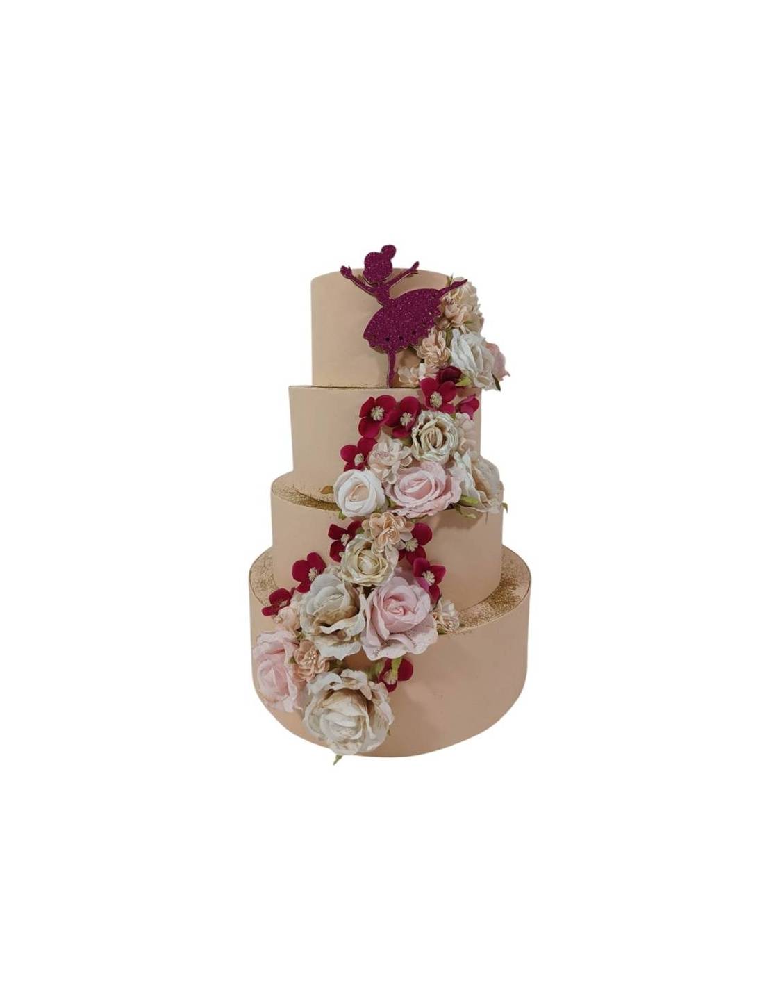 Torta scenografica finta con elegante e raffinato decoro floreale, ballerina e brillantini dorati.