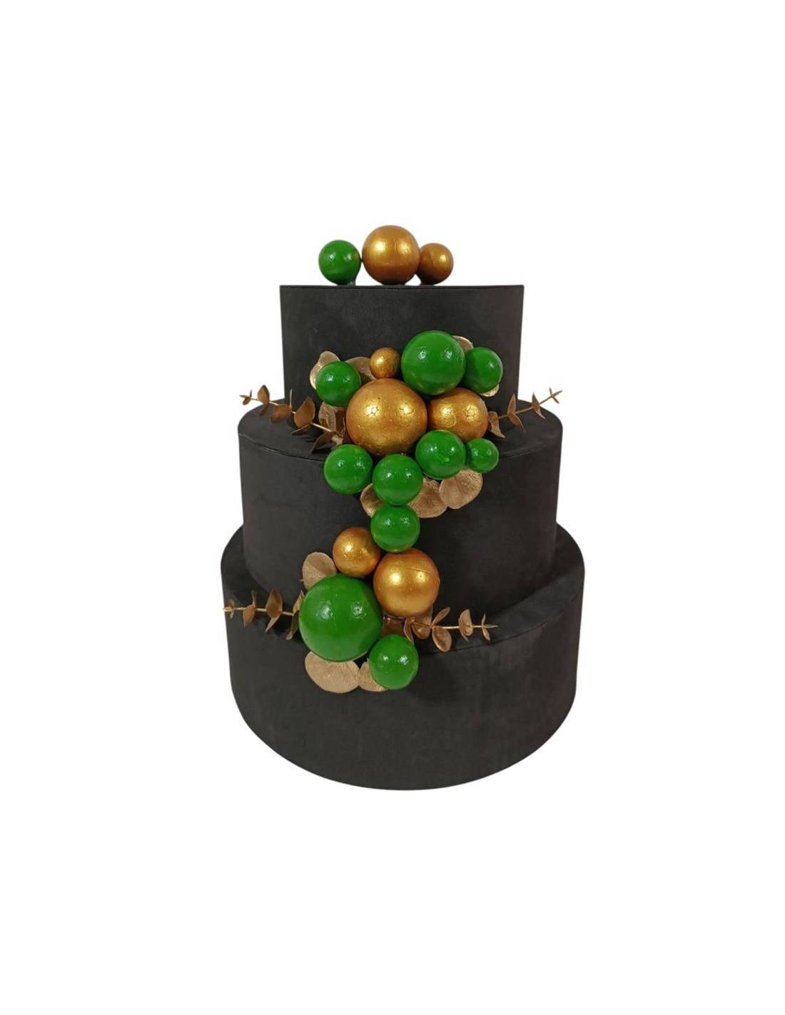Torte finte scenografiche a tre piani nera con decoro palloncini verdi e dorati.