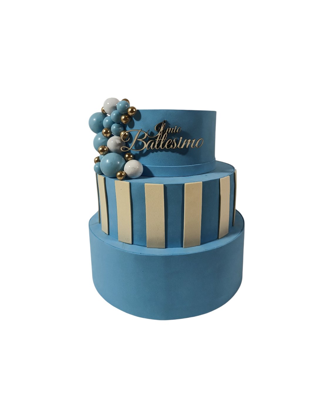 Torta scenografica battesimo celeste con strisce bianche, decoro palloncini abbinati e scritta "Il mio Battesimo" in legno.