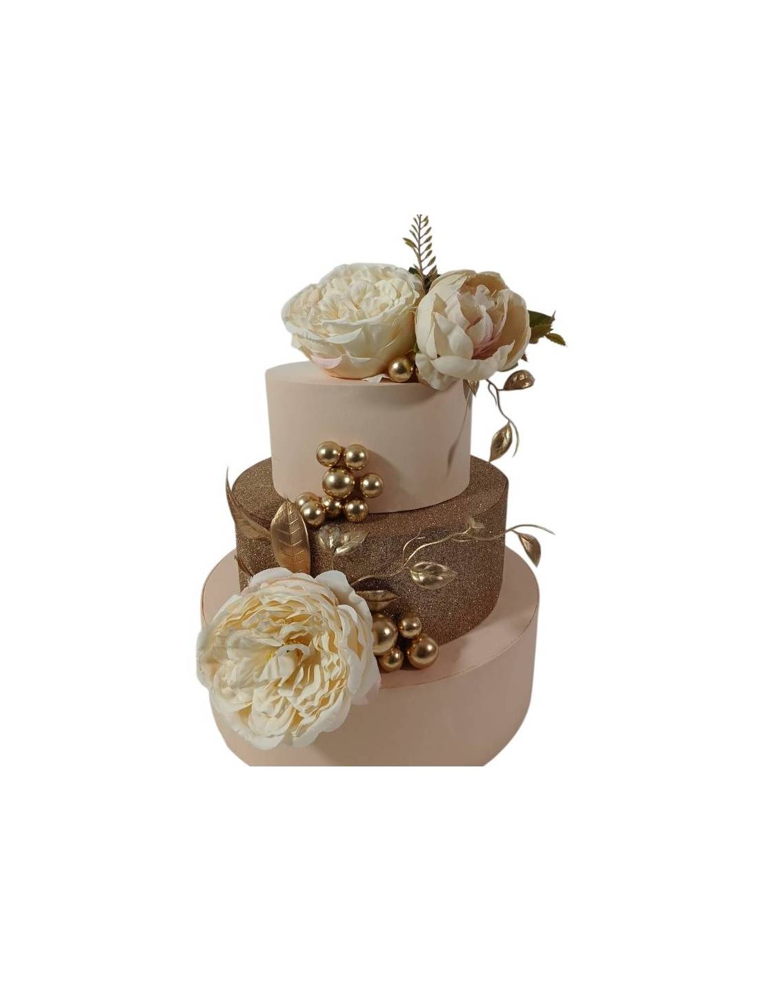 Torte finte scenografiche a tre piani con decoro floreale e dettagli sfere e foglie dorate capaci di dare un tocco unico alla struttura.